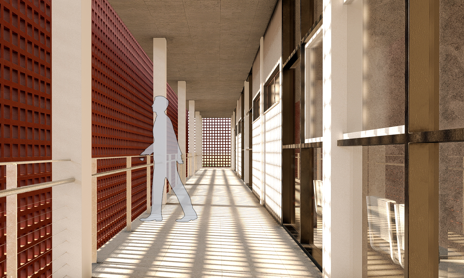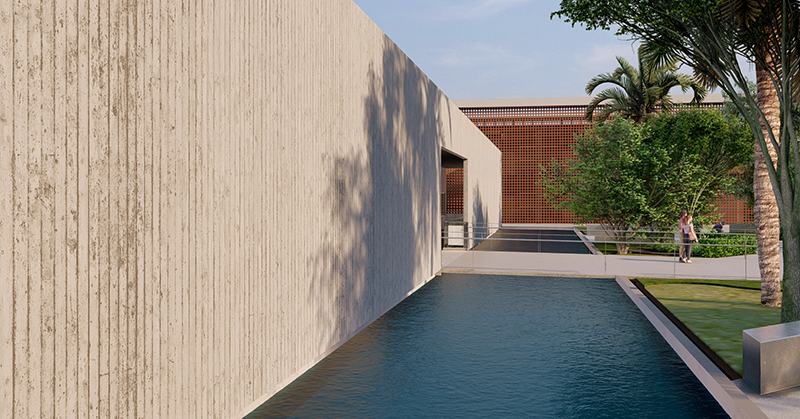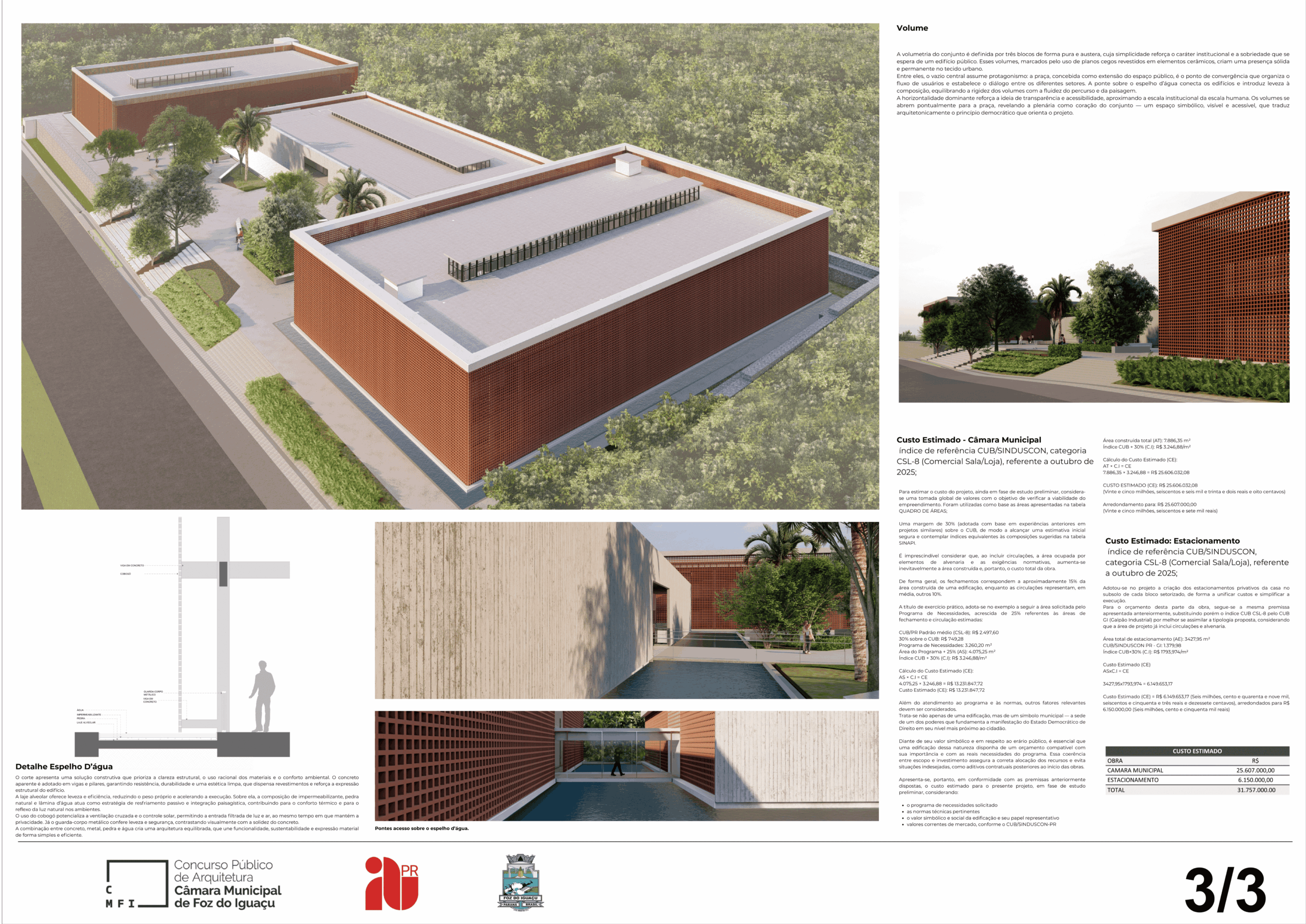 O espelho d’água remete à geografia de Foz do Iguaçu, cidade contornada por rios e pontes, enquanto uma segunda pele em elementos cerâmicos garante conforto térmico, ventilação natural e unidade visual.