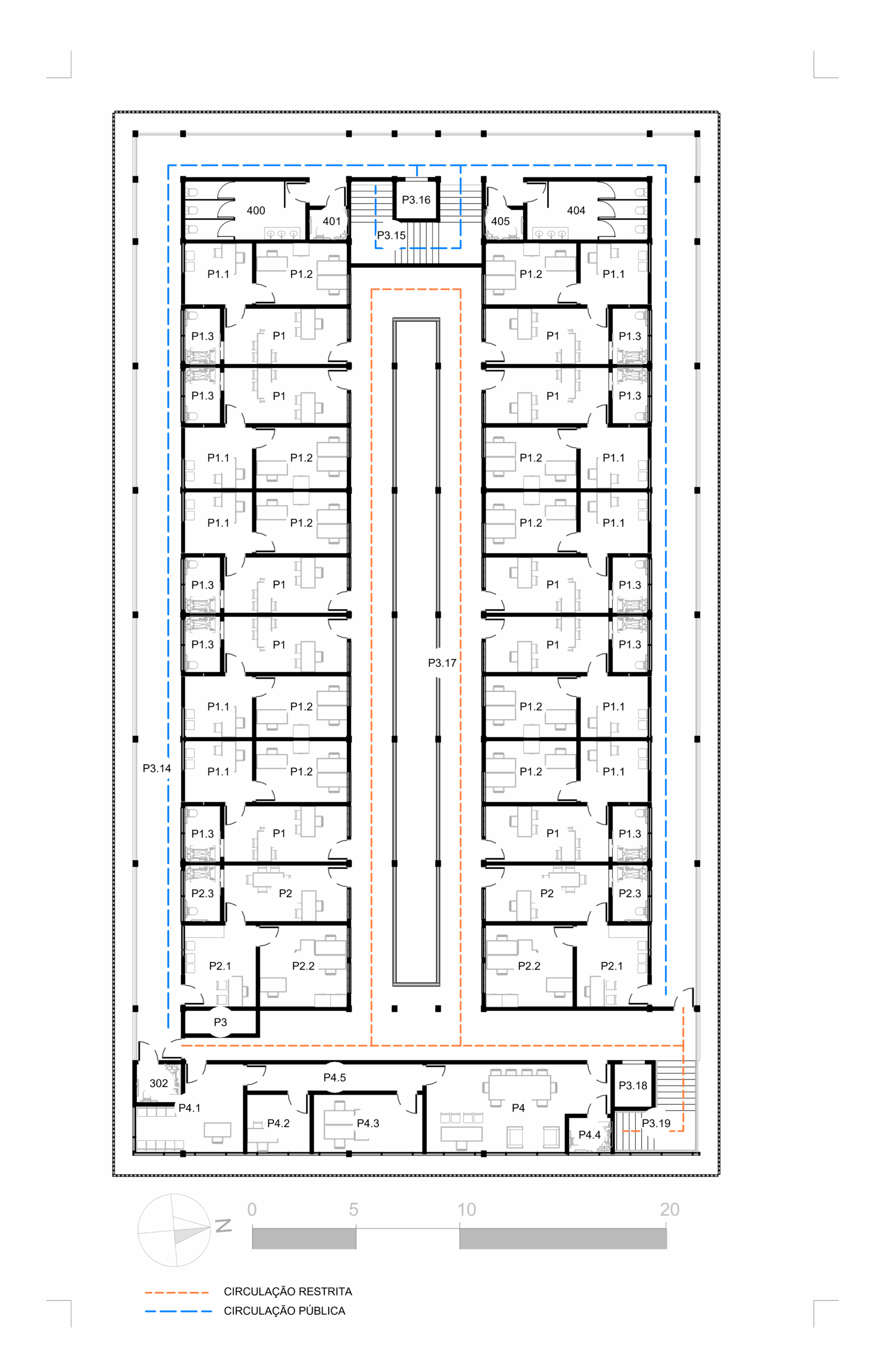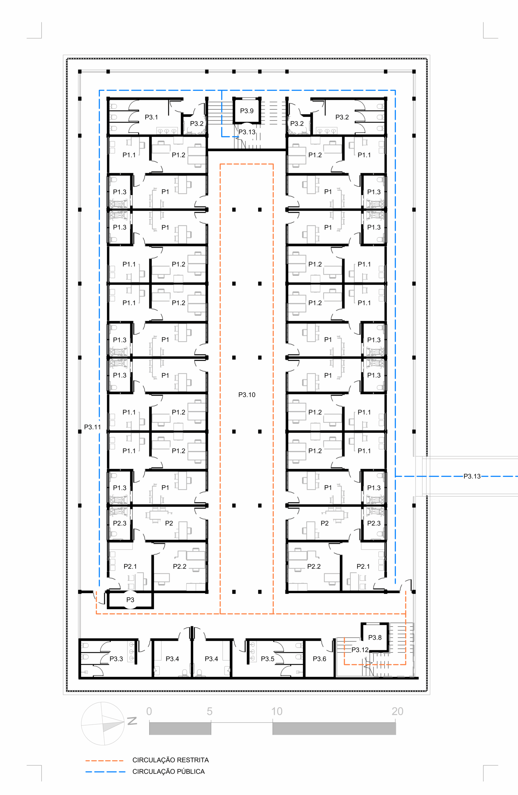 Três edifícios interligados por pontes sobre um espelho d’água conformam uma praça central, onde o cidadão é convidado a participar e se reconhecer como parte ativa do espaço. Essa configuração equilibra transparência e segurança, separando fluxos públicos e administrativos de forma clara e eficiente.